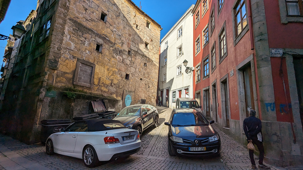 Hinter der Telefonzelle zweigen wir links in die Rua da Bainharia ab und überqueren die Rua dos Mercadores, zu der wir später nochmals zurück kommen. Wir gehen gerade aus weiter und merken sehr rasch, dass es schon beschwerlich sein kann, ständig so steil bergauf und bergab zu gehen. Außerdem überrascht uns die Tatsache, dass in diesen engen steilen Gassen auch Autos fahren.