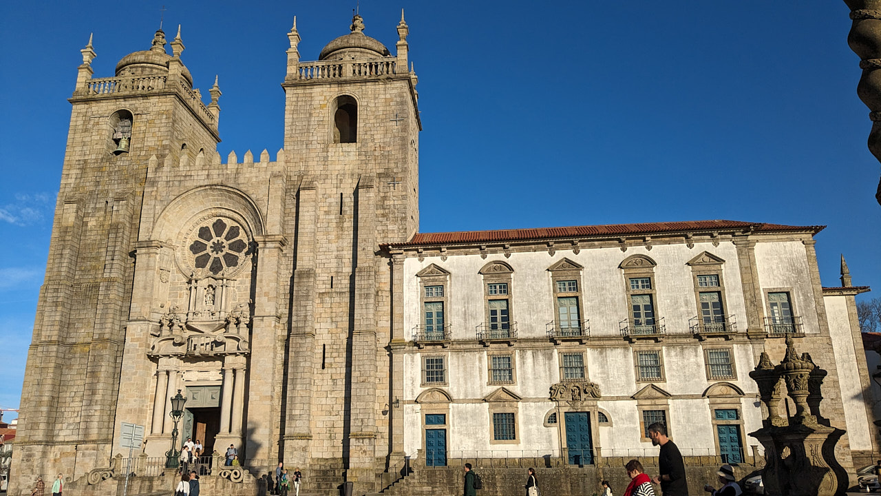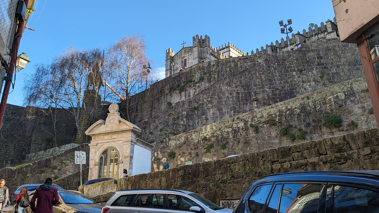 Wir biegen in die Rua Escura rechts ab. Plötzlich öffnet sich der Blick hoch hinauf auf die Kathedrale von Porto, Sé do Porto, das bedeutendste Heiligtum dieser Stadt.