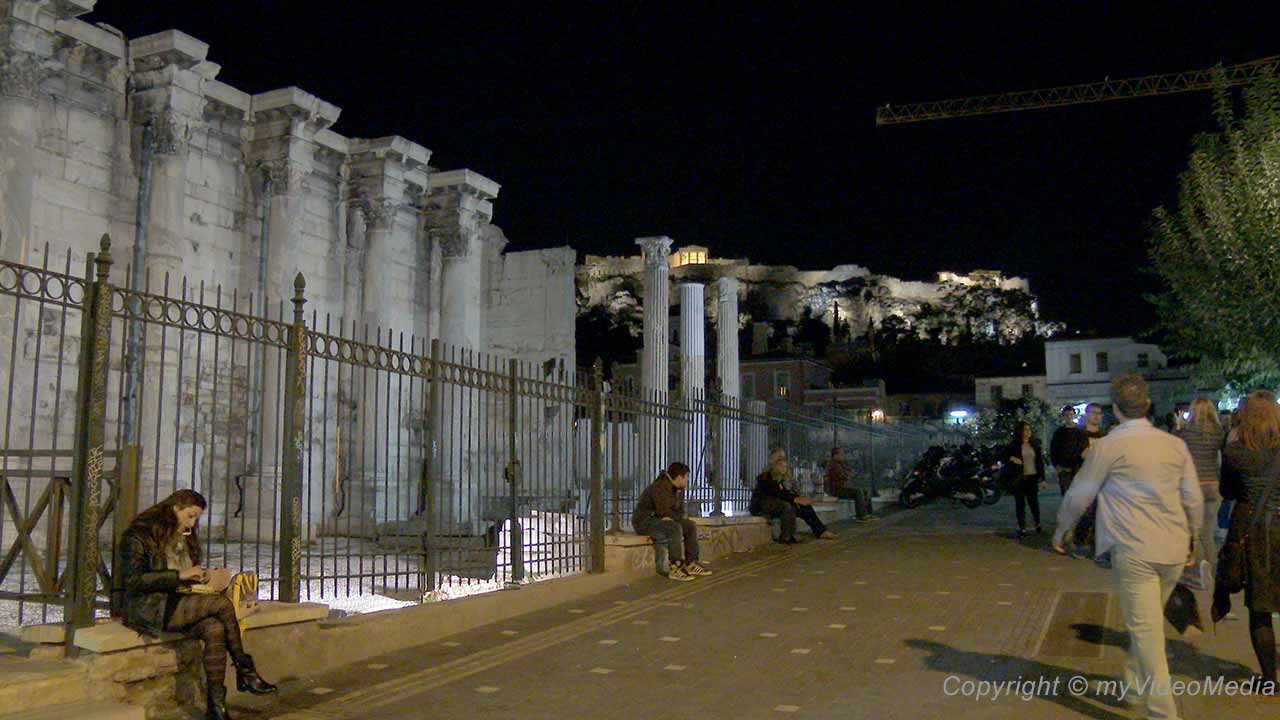 Once back at Monastiraki Square, we throw a glance at the illuminated Hadrian’s Library and the Acropolis.